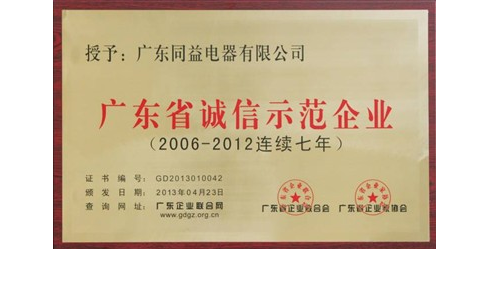 4月,獲 “廣東省誠信示范企業(2006-2012連續七年)”稱號;