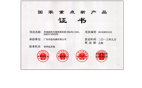 9月,產品“冷熱聯供全效熱泵機組”獲“國家重點新產品”稱號;