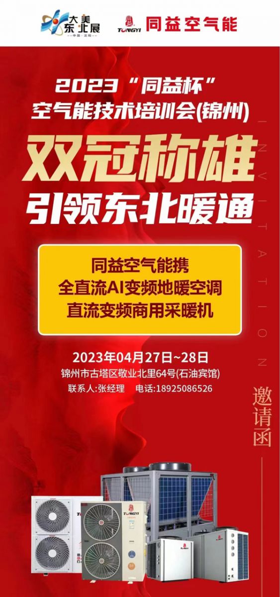2023“同益杯”空氣能技術培訓會將于4月27日-28日在錦州市古塔區錦州石油賓館隆重啟幕!本次培訓會由同益空氣能獨家冠名,匯聚東北各地經銷商齊聚錦州,共謀東北暖通行業千億市場!